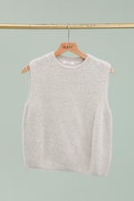 A soft, timeless sleeveless knit in a warm beige tone, designed for effortless layering.