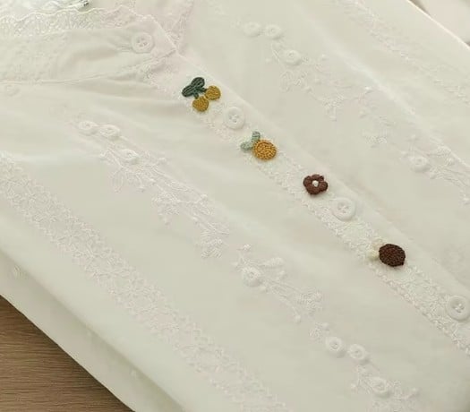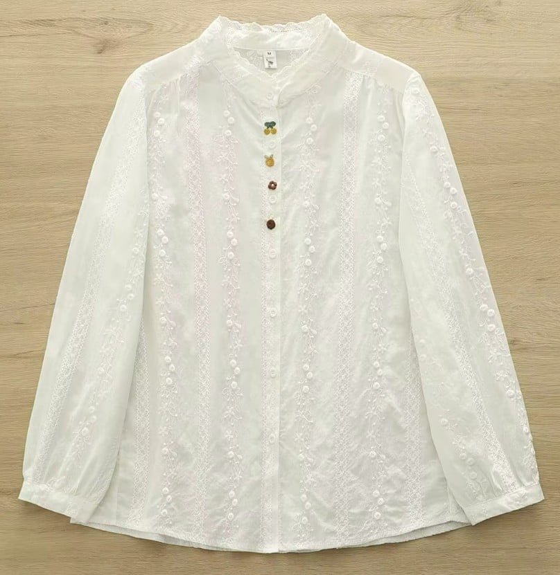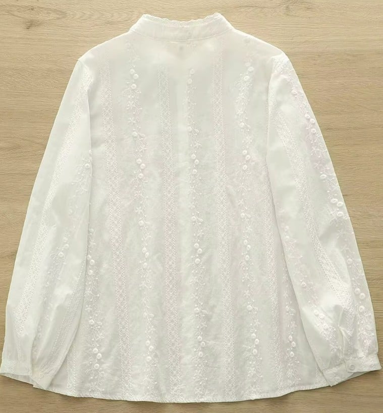 A delicate white cotton blouse with fine embroidered details and long sleeves.