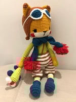 Felix is a curious little fox with an adventurous spirit. Dressed for chilly days in his striped trousers, cozy scarf, and playful aviator goggles, he’s always ready to explore the world. His long tail and bright pom-pom details add a touch of whimsy, making him a charming companion for imaginative play or gentle decoration.