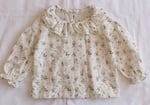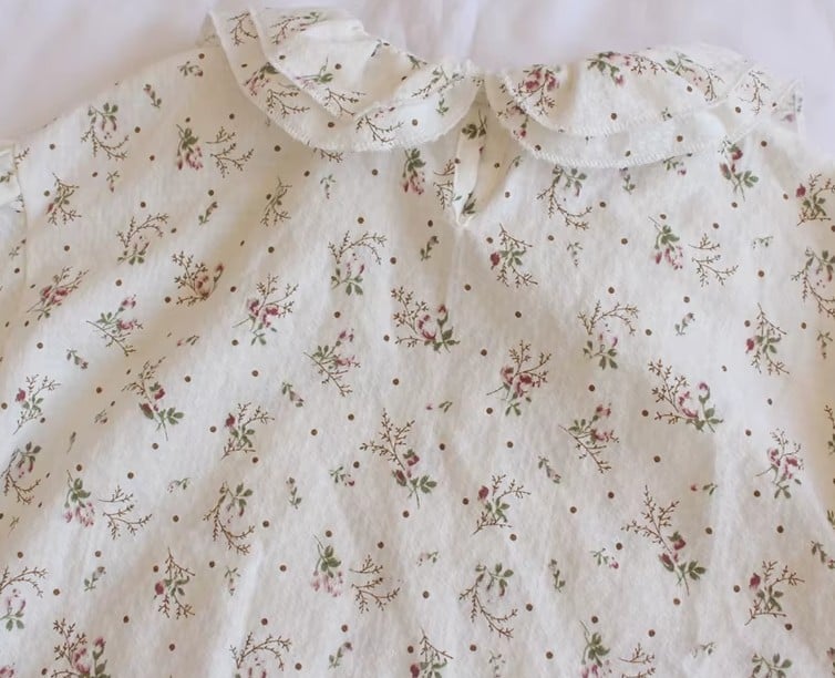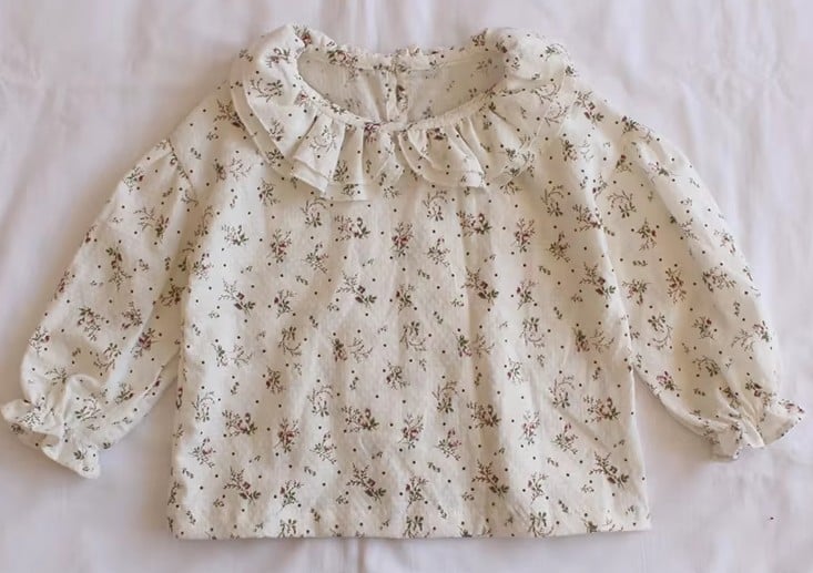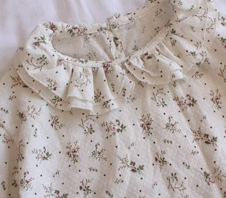The blouse is made from 100% soft cotton with a delicate floral print. Its romantic ruffled collar and puffed sleeves give it a vintage touch that feels both classic and playful.