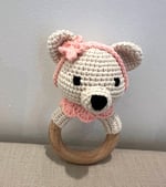 Handcrafted Crochet Creme Bear with headband Rattle Wooden Teether