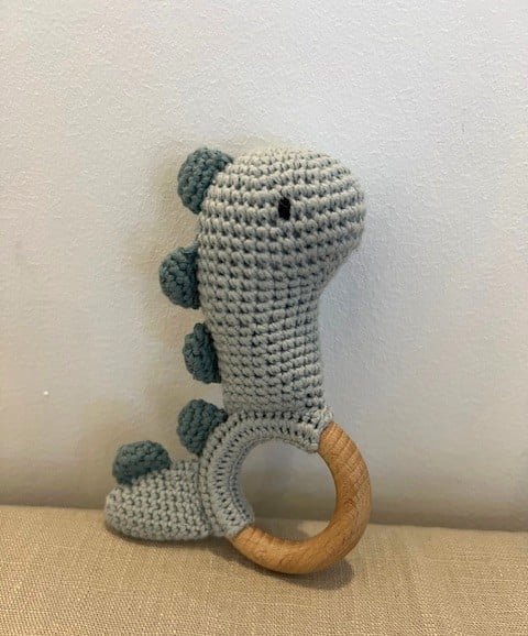 Handcrafted Crochet Dinosaur Rattle Wooden Teether