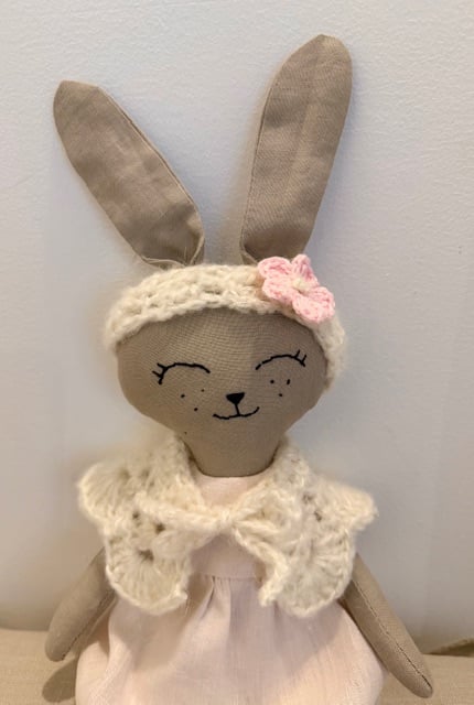 This handmade fabric rabbit doll is carefully sewn and finished by hand, using natural fabrics and soft crochet details.
