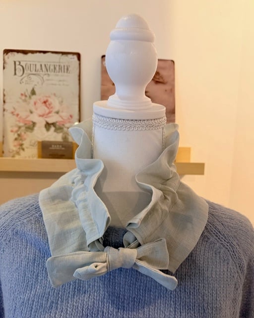 Crafted in pure linen, it features gentle ruffles and adjustable ties, allowing it to be worn comfortably around the neck or layered over knitwear, dresses, or blouses.