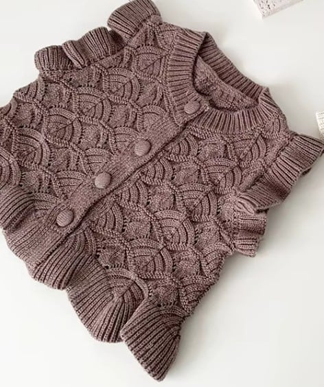 A soft and beautifully knitted baby vest with a delicate textured pattern and wooden-style buttons.